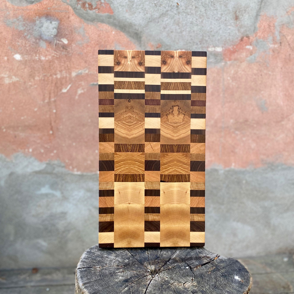 Elegantes Hirnholzschneidebrett aus Esche, Zebrano, Ahorn, Eiche, Kirsche und Nussbaum.